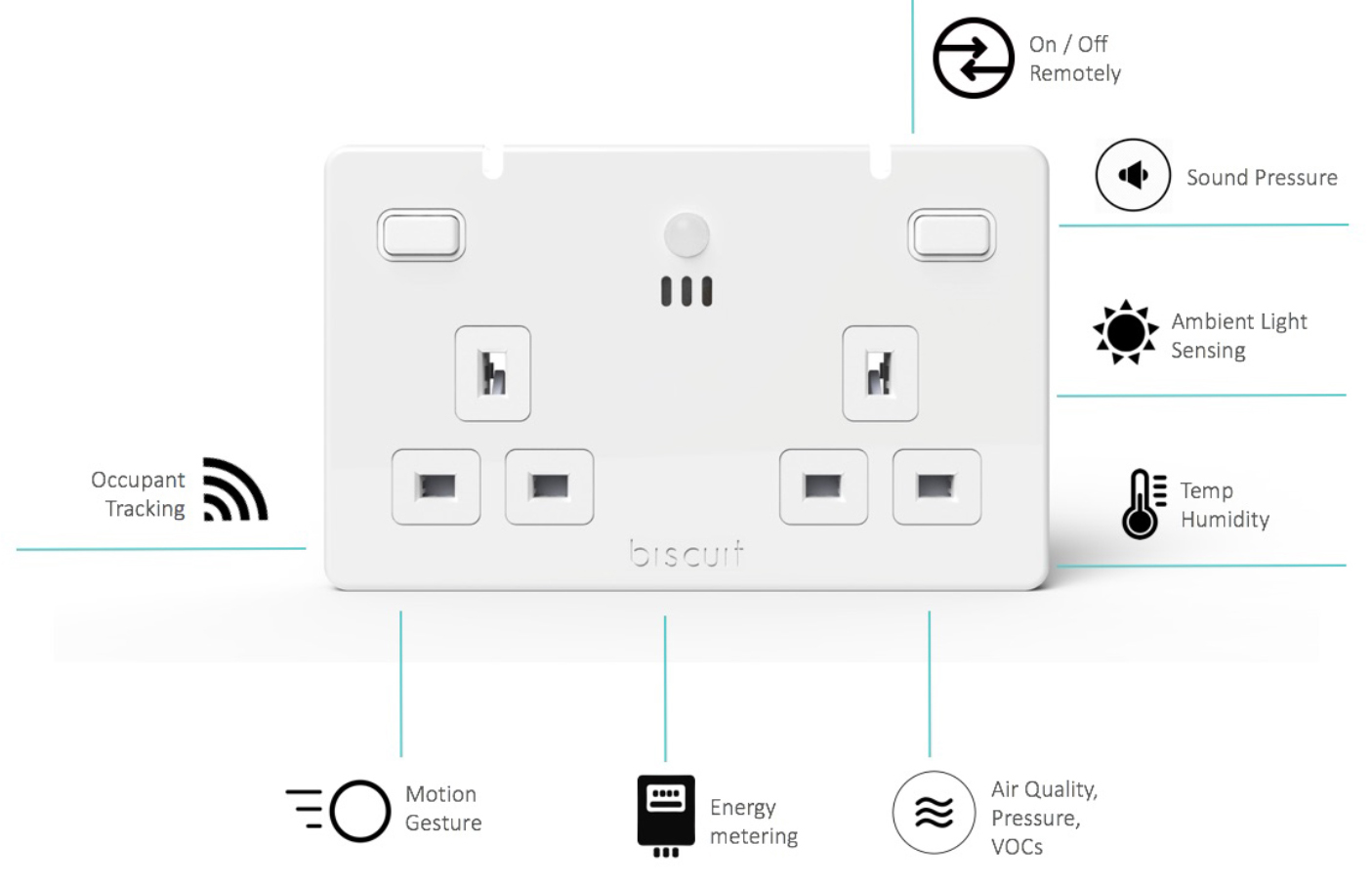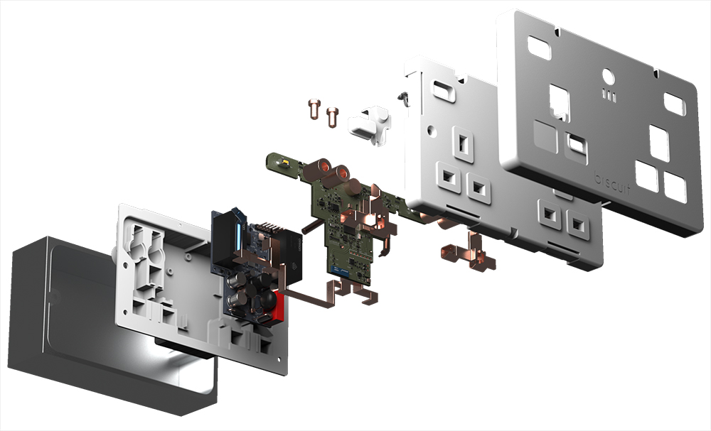 The smart double socket outlet includes electronics to monitor and report seven key parameters that provide rich data on building usage. These include energy consumption, temperature, humidity, air pressure, sound pressure, motion, and light levels.
