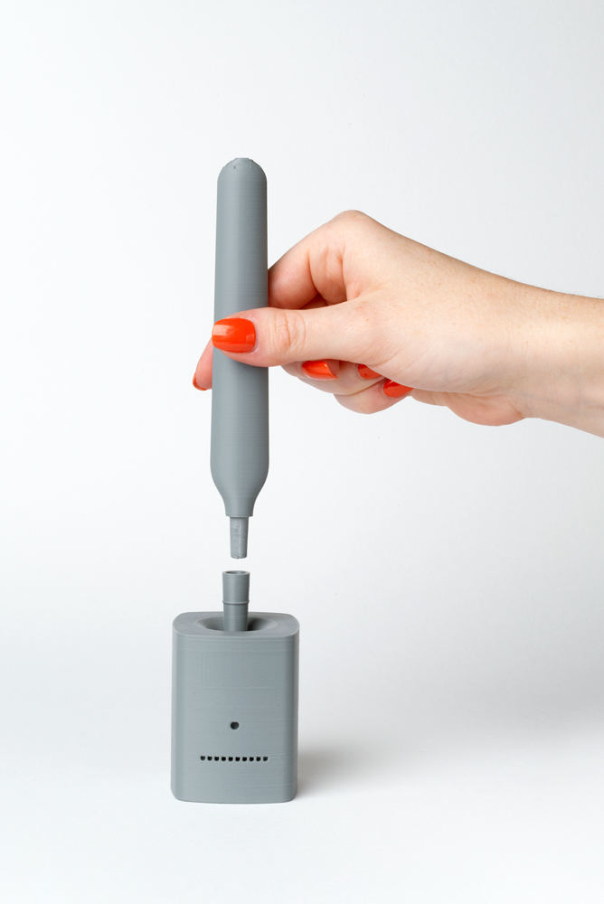 The result: Horb – a concept for an at-home diagnostic device that measures hormone levels while seamlessly integrating into users’ daily routines. Before daily teeth brushing, users would use a unique collection swab to take a saliva sample and deposit the swab head into a countertop diagnostic device. This would then analyze the sample and take the reading while they brush their teeth. The diagnostic device would connect via Bluetooth to an app, allowing users to monitor their daily hormone levels and receive pertinent data insights. The app would also provide a general picture of their reproductive health through synthesizing Horb data and health data from other wearables such as the Apple Watch and Oura ring.