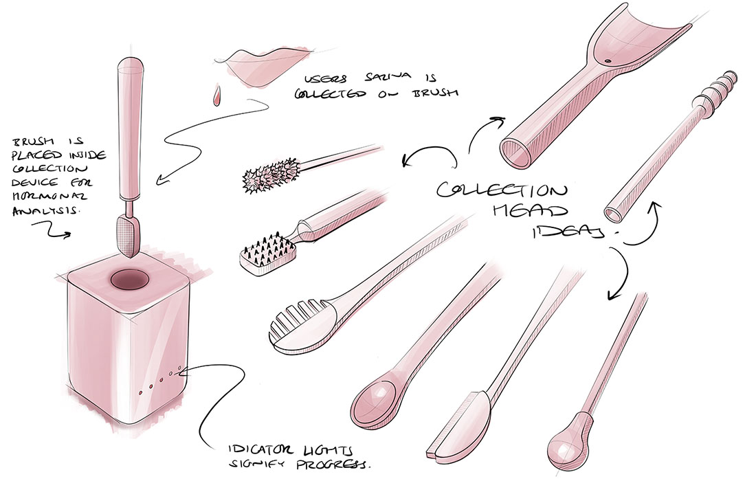 We assessed existing hormone-tracking technologies and evaluated their potential to form a user-centric solution, coming to focus our attention on the rapidly advancing science of saliva diagnostics, which enables the tracking of progesterone.